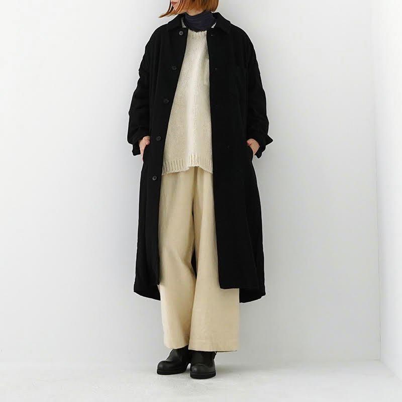 普遍的な新しさをテーマに、カッティングやテキスタイルにこだわり、シンプルながらこだわりを感じることが出来る飽きの来ない衣服を生み出すブランド「ゴーシュ」。 こちらはウールとキャメルを混紡したツイルを起毛した、柔らかく肌触りの良いコートです。着ていただくと軽やかで上品な佇まいです。軽さを活かすために裏地はなく、バックスリットも入っているので足さばきもしやすくなっております。 シンプルなデザインで、マフラーやシューズ、バックなどの小物のアレンジも楽しんでいただきやすいです。袖口はボタンですぼめられるようになっております。 ※ライトベージュは、素材感の楽しめる未晒し(毛のままの色)です。 23AW size: 2 着丈104cm 肩幅63cm 身幅60cm 袖丈45cm color: ライトベージュ / ダークブラウン / ブラック material: 綿52%(裏地),ウール38% , キャメル10% model: 158cm(ライトベージュ、ブラック着用) 取り扱い店舗・・・dieci kyutaro店 2F 着用アイテム:ニット