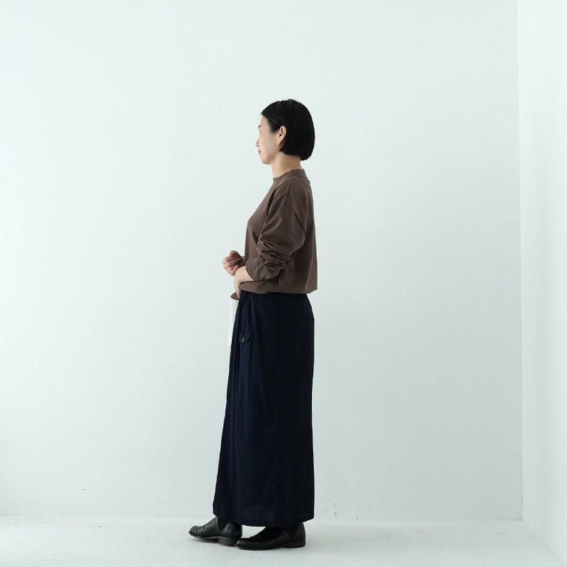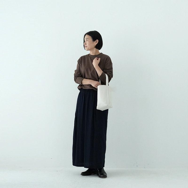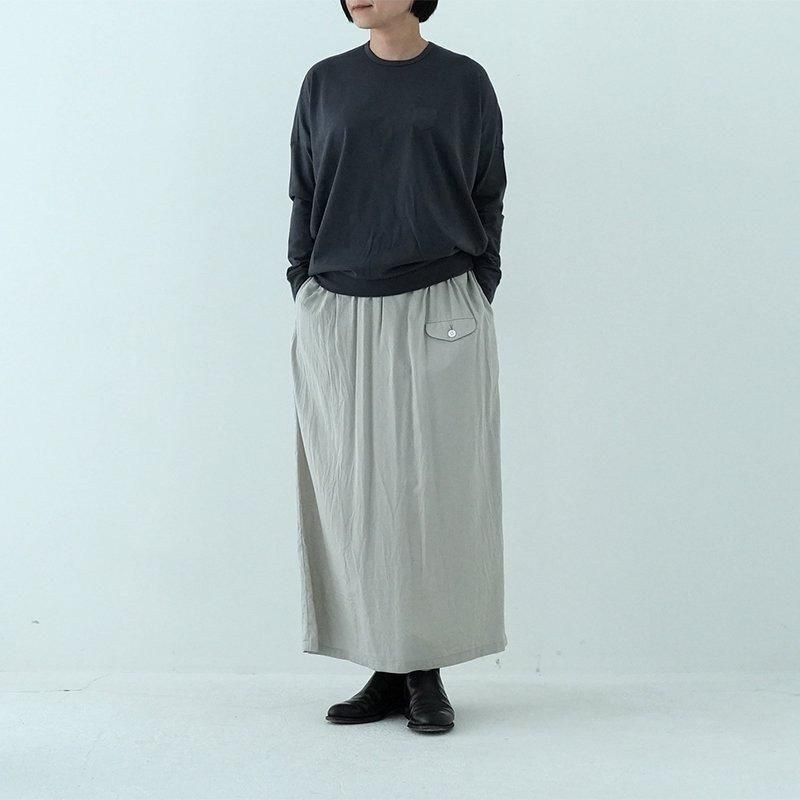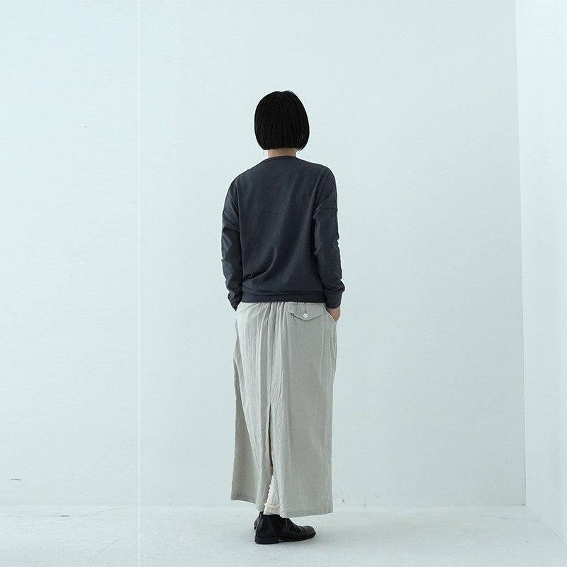 普遍的な新しさをテーマに、カッティングやテキスタイルにこだわり、シンプルながらこだわりを感じることが出来る飽きの来ない衣服を生み出すブランド「ゴーシュ」。 繊細なコットンサテンを使用したギャザースカート。 しなやかな質感は秋冬のコーディネートに柔らかさと軽やかさを出してくれます。 ほんのり光沢を感じる風合いも魅力的な一枚。いつものコーディネートに差し込むだけで印象をグッと格上げしてくれます。 ストレートに落ちる形で収まりが良く、コーディネートもしやすいアイテムです。 後ろにはしっかりとスリットが入っており足捌きがしやすく、中にはペチコート代わりの裏地もあるので透け感も気にせずご着用いただけます。 腰あたりに飾りとして配置されたポケットがゴーシュのデザインらしいポイントです。 24AW size:2 ONE SIZE ウエスト30cm~(ゴム仕様) , 着丈85cm color: グレーベージュ / ホワイト / チャコールグレー / ネイビー material:コットン100% model:160cm 取り扱い店舗・・・dieci kyutaro店 2F