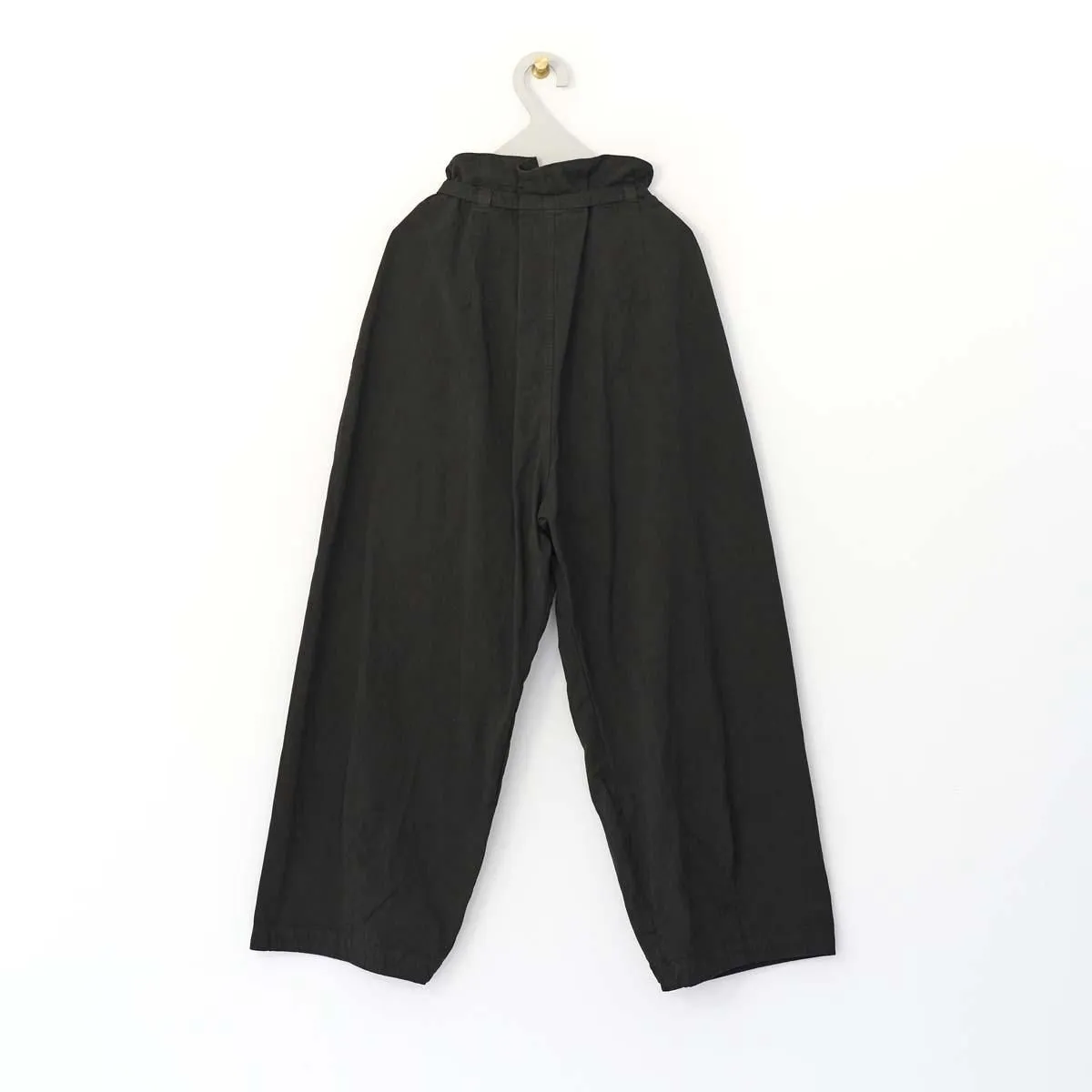 ”quitan(キタン)”というブランド名は日本語の「綺譚(きたん)」からきており「美しい文章で書かれた物語。世にも不思議な話」という意味があります。 世界各国様々な文化から着想を得ておりなされるquitanのお洋服はまさに文化の交歓の記録、”綺譚”そのものです。 こちらは1940年代後期にフランス軍に支給されていた医療用パンツから着想を得たパンツです。第二次世界大戦禍で、タイパンツのような簡素なディテールをモダンな仕立てで再現されています。生地は化学繊維のなかった時代のミリタリーウェアのなかで、スモックやオーバーパンツに使用されていた簡素でありながら密度があり、凛としたハリのあるコットンファブリックをイメージしています。 ※色節やネップは天然素材の特性です。 ※素材の特性上、水洗いで多少縮んだり、風合いの変化が起こることがあります。ご了承ください。 25SS size:1 ウエスト:55cm 股上:42cm 股下:65cm わたり:41cm ※個体差や多少の色むらがありますが商品の特性となります。 color: BLUE,IVORY BLACK,WHITE material:COTTON100% model:170cm 通常価格¥32,000+税→40%OFF ¥19,200+税 お取り扱い店舗・・・dieci kyutaro店 2F