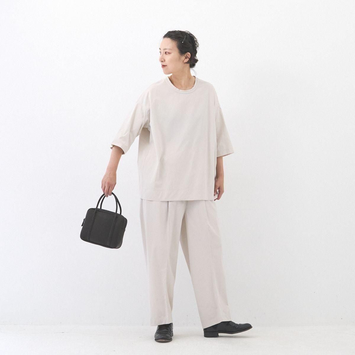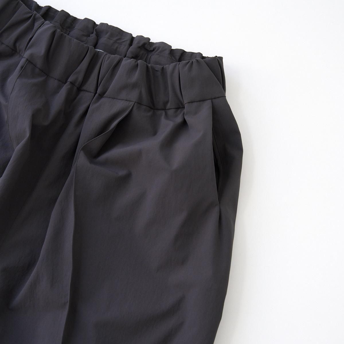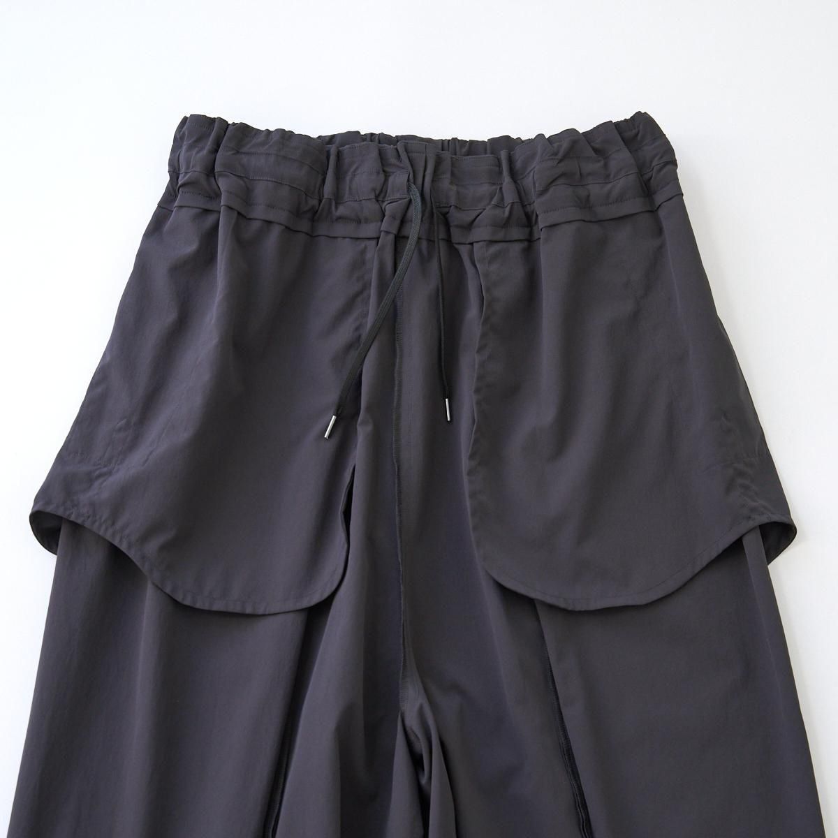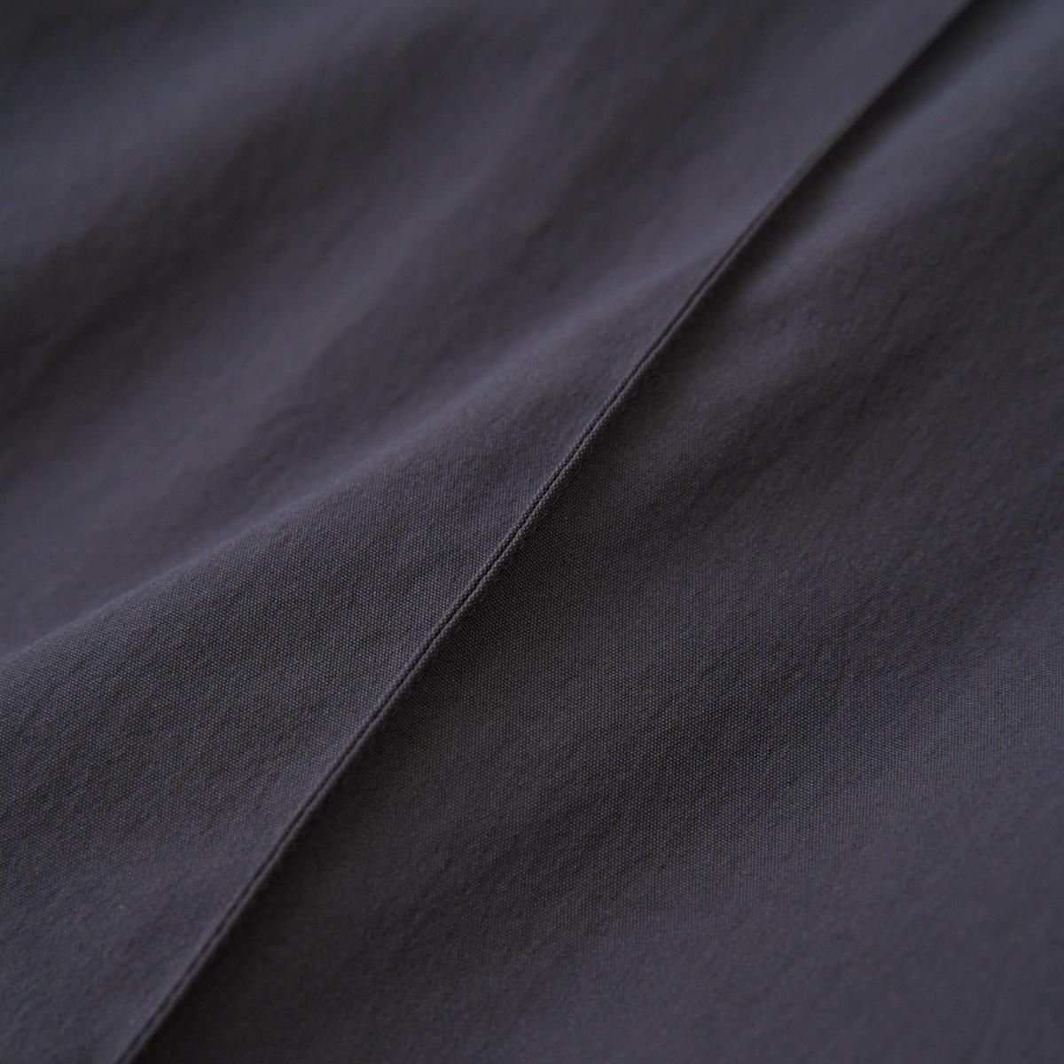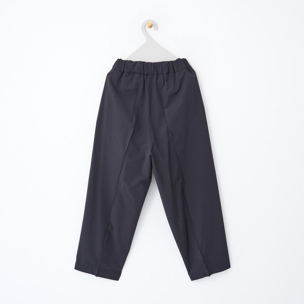 光沢のないポリエステルの平織り生地を用したパンツ。薄手ですが淡色でも透けにくく、ストレッチがしっかりと効いているため、ストレスなく気軽に着用していただけます。またシワがよりにくく乾機能が高いので、取り扱いのしやすさも嬉しいポイント。肌にまとわり付かないサラッとした肌触りで暑い季節にも最適です。 膝下から裾に向かって前向きにカーブする三日月型の特徴的なフォルムですが、着用するとボリュームが出過ぎず美しいシルエットを保ちます。 size:3 ウェスト34~48cm/股上44cm/股下61cm/わたり34cm/裾幅23cm ※サイズ計測の多少の誤差はご了承下さい color:Ecru/Dark Grey material:Polyester 100% model:163cm(Ecru着用) お取り扱い店舗・・・ dieci芝川ビル店 -------------------------------------------------------- no control air デザイナーの米永至さんが手がけるno control air。2002年にスタートしたユニセックスブランドです。 一見ベーシックでシンプルでありながらどこか新しく、造形や素材に対する深い知識に裏付けされたお洋服を創っています。