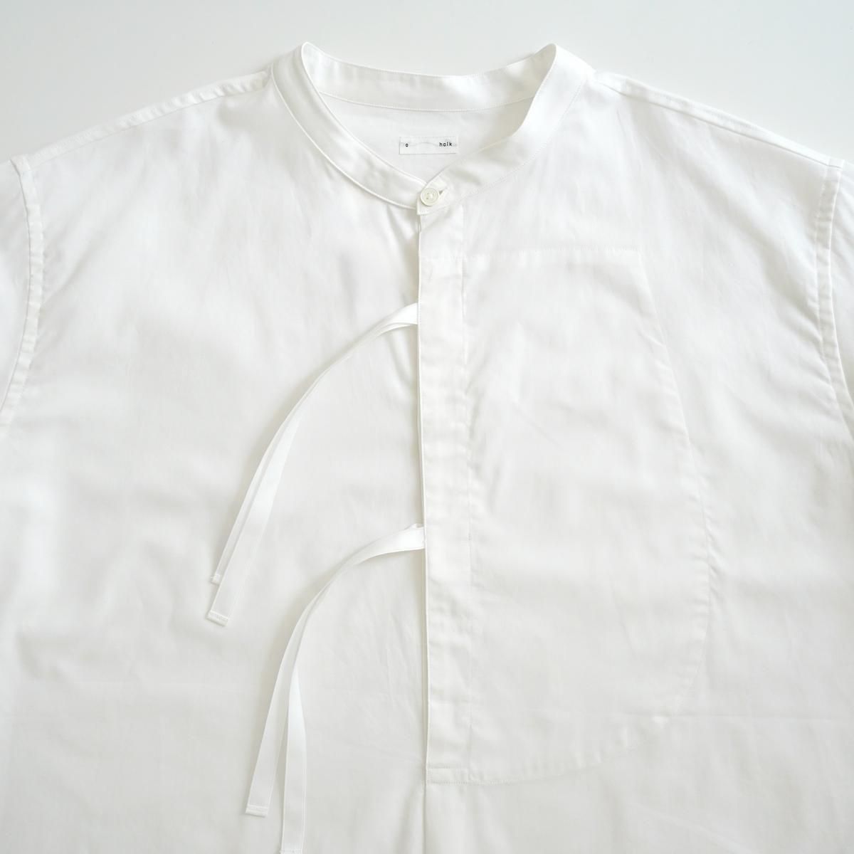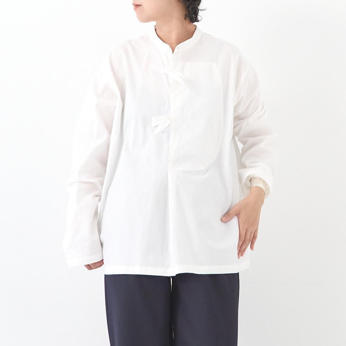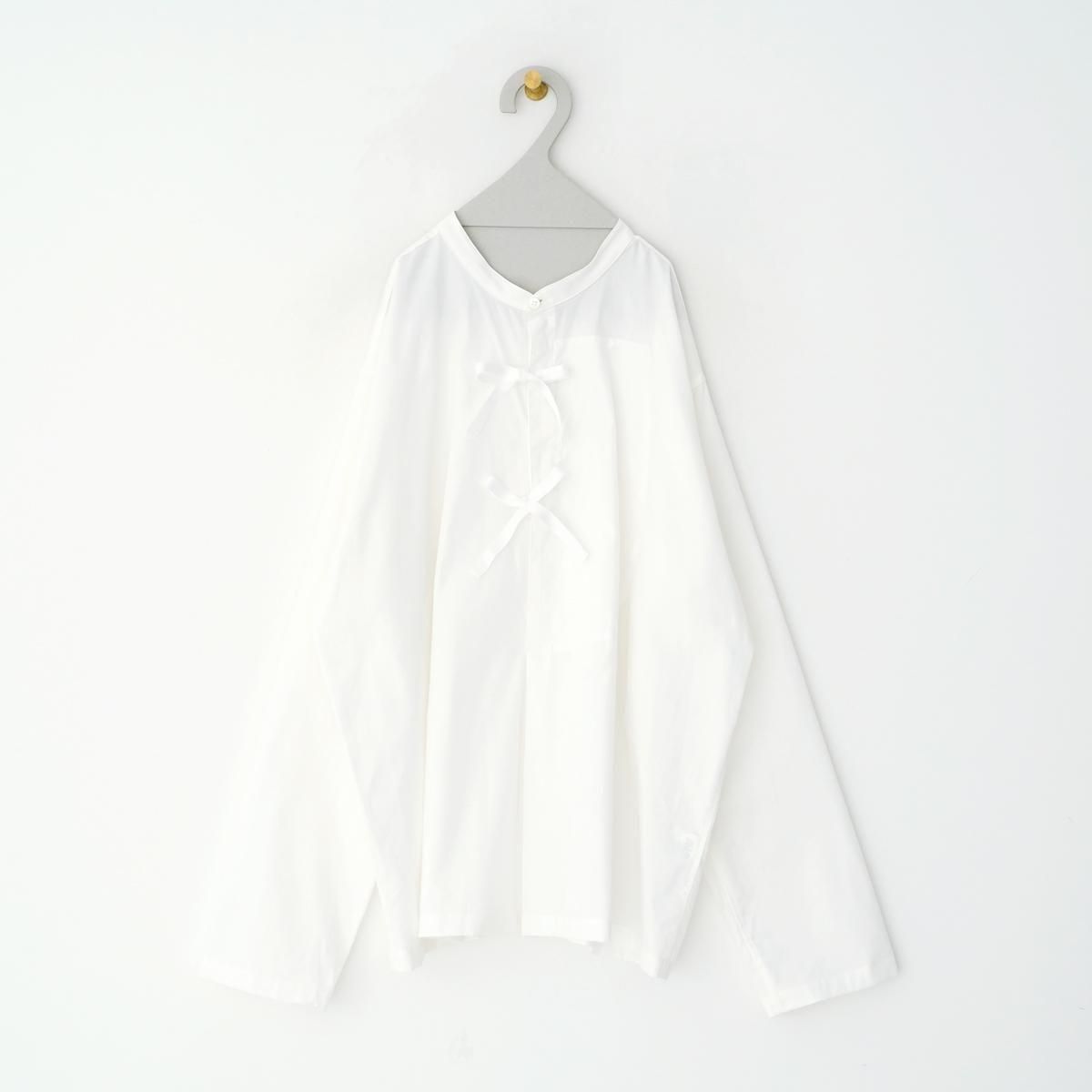 フロントのリボンが象徴的なブラウス。ソフトな肌触りで上品な光沢がある、薄手のオックス生地を使用しています。 スタンドカラーの襟元から比翼ボタンになったプルオーバー型のカジュアルなシルエット。開き止まり部分にタックを入れていることで、動きのあるラインを作っています。胸元には隠しポケットがあり、丸く描かれたステッチが密かなアクセントに。また長めの袖はカフスのない仕様で捲りやすいデザインです。 比翼についた2箇所のリボンは、きちんと結んだ時の愛らしさや、ほどいたラフな印象など、結び方一つで雰囲気の違いを楽しめます。清潔感と女性らしさの漂う一枚です。 25AW size:0 着丈68cm/身幅66cm/肩幅50cm/袖丈62.5cm ※サイズ計測の多少の誤差はご了承下さい。 color:White material:cotton100% model:163cm -------------------------------------------------------- holk|ホーク "身近な人々のための服の在り方”をコンセプトに、尾州の小さな工場の熟練された職人の手によって機織りから縫製までの工程を行なっています。若き職人とともに技術を学び後世に残るものづくりに取り組み、また物作りから購入までに関わる全ての人の心が豊かになるプロダクトを目指しています。 size_chart