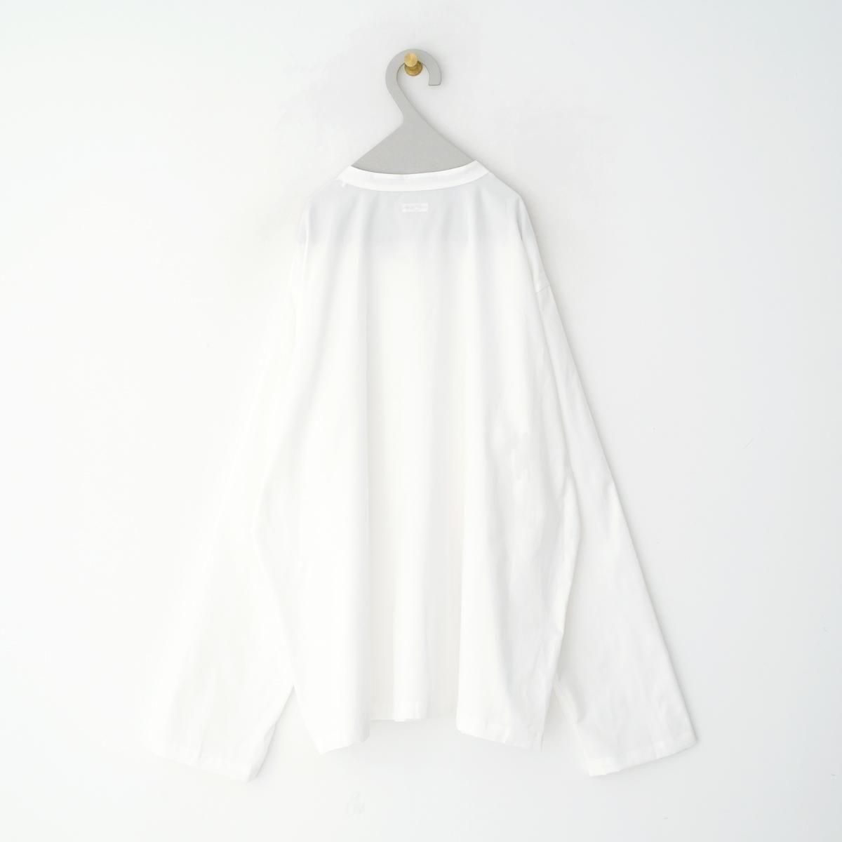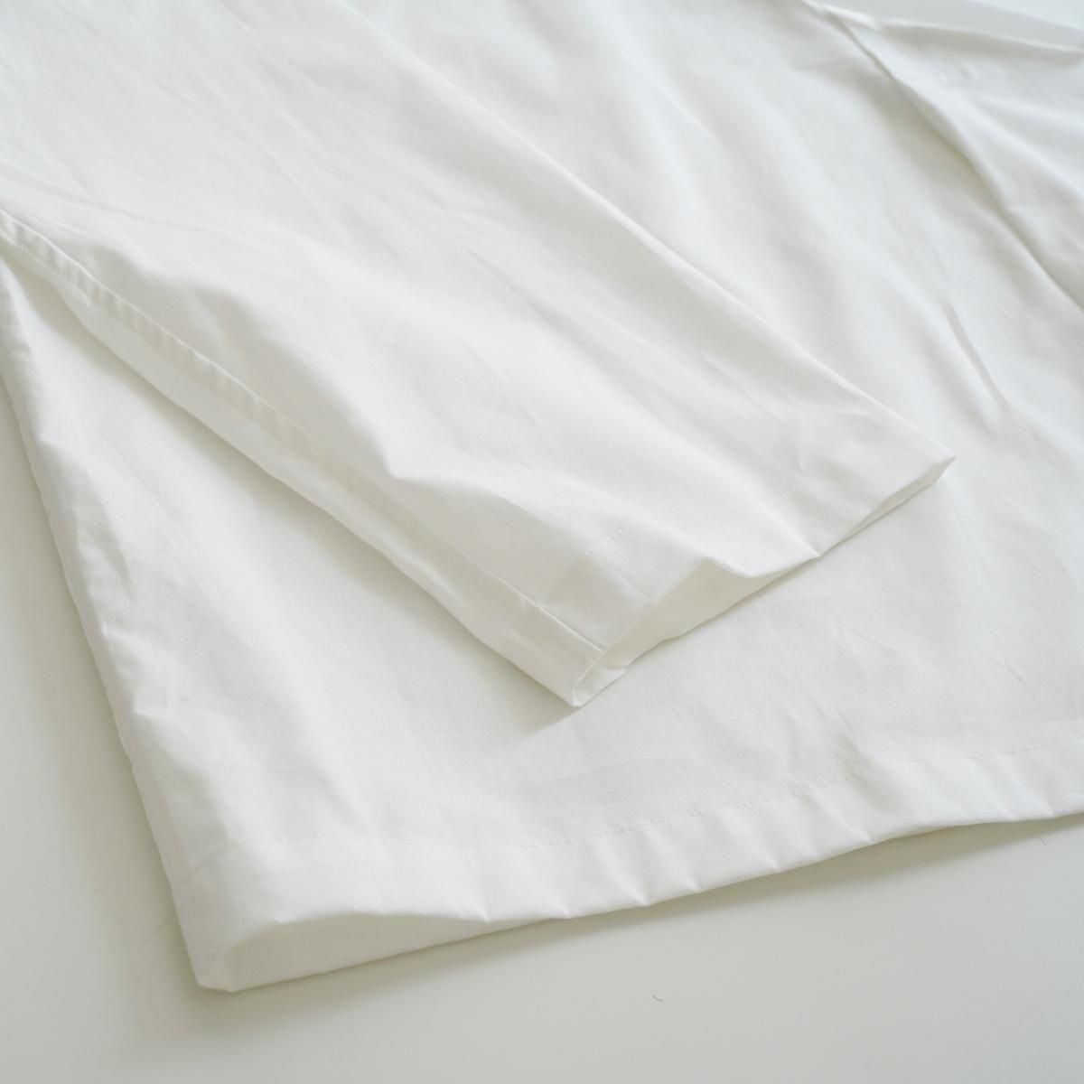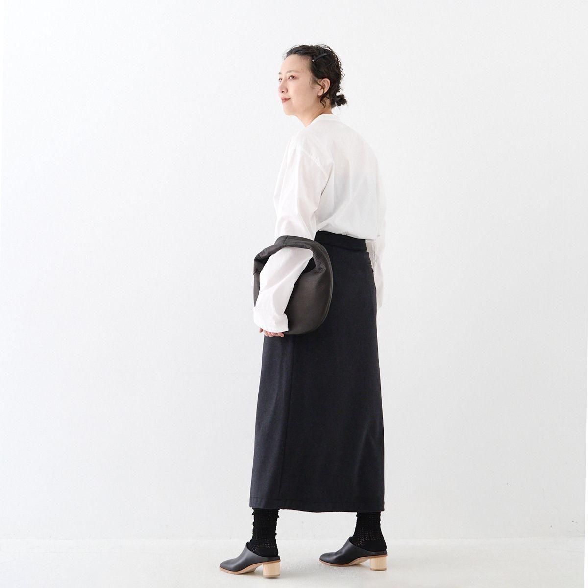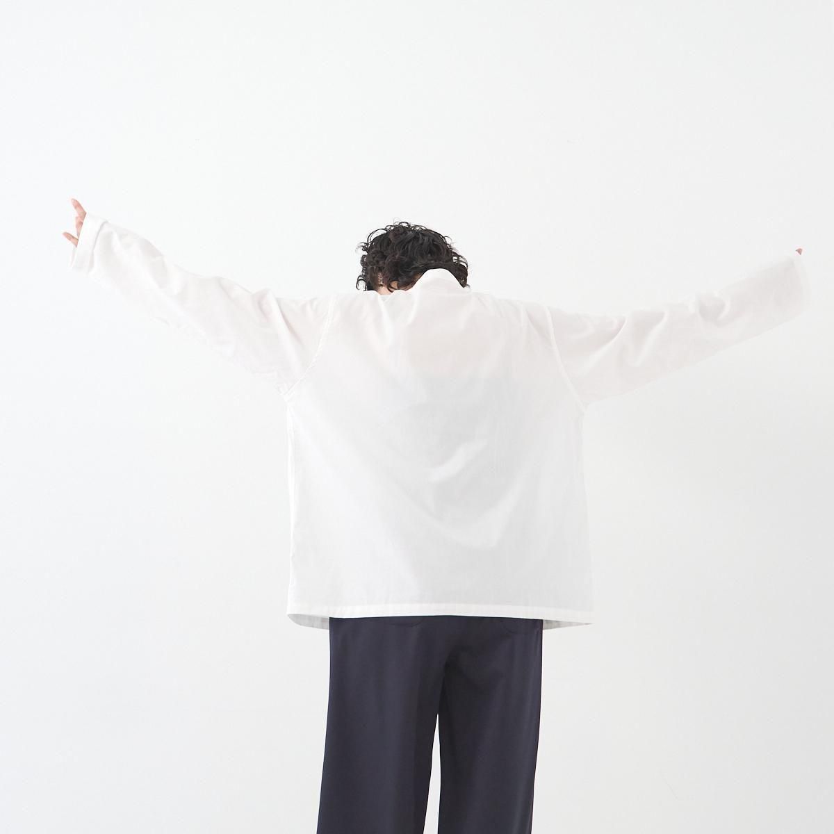 フロントのリボンが象徴的なブラウス。ソフトな肌触りで上品な光沢がある、薄手のオックス生地を使用しています。 スタンドカラーの襟元から比翼ボタンになったプルオーバー型のカジュアルなシルエット。開き止まり部分にタックを入れていることで、動きのあるラインを作っています。胸元には隠しポケットがあり、丸く描かれたステッチが密かなアクセントに。また長めの袖はカフスのない仕様で捲りやすいデザインです。 比翼についた2箇所のリボンは、きちんと結んだ時の愛らしさや、ほどいたラフな印象など、結び方一つで雰囲気の違いを楽しめます。清潔感と女性らしさの漂う一枚です。 25AW size:0 着丈68cm/身幅66cm/肩幅50cm/袖丈62.5cm ※サイズ計測の多少の誤差はご了承下さい。 color:White material:cotton100% model:163cm -------------------------------------------------------- holk|ホーク "身近な人々のための服の在り方”をコンセプトに、尾州の小さな工場の熟練された職人の手によって機織りから縫製までの工程を行なっています。若き職人とともに技術を学び後世に残るものづくりに取り組み、また物作りから購入までに関わる全ての人の心が豊かになるプロダクトを目指しています。 size_chart