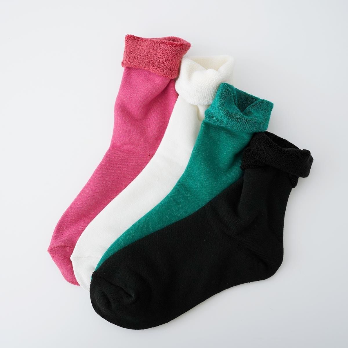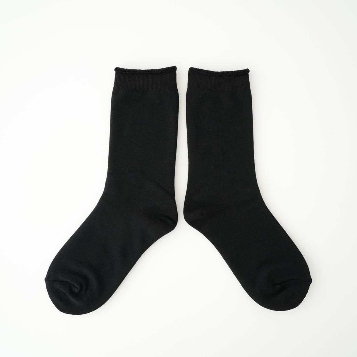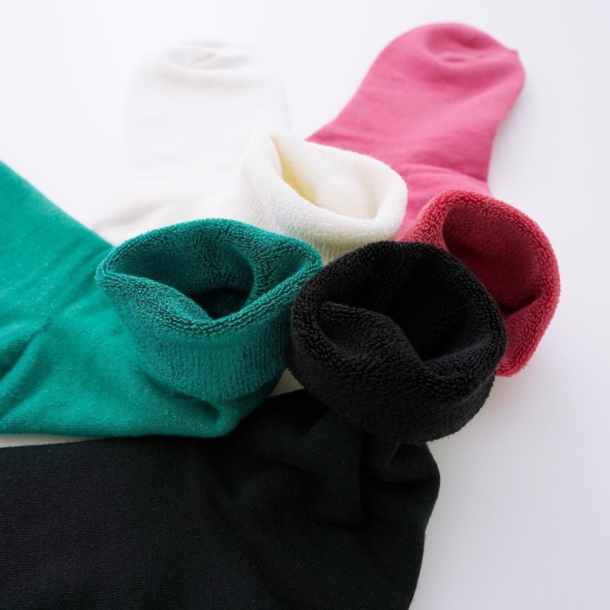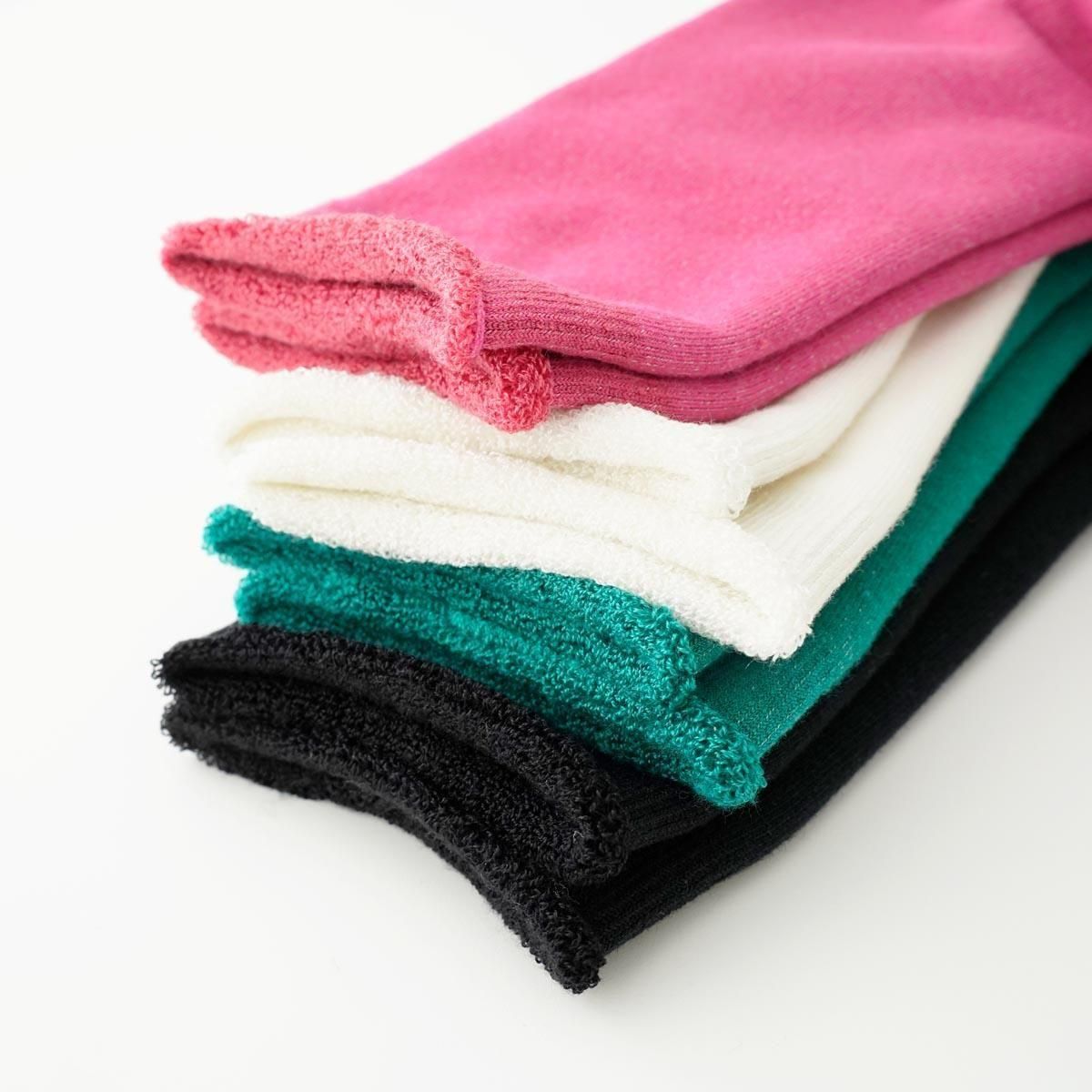 日常とともにある上質と高揚感を大切に丁寧なものづくりを行うブランド『ROTOTO』。 「冷え」に向き合い、温かさと高揚感をひと編みずつ紡ぐ、『AmwR』は『ROTOTO』が靴下づくりで培ってきた知恵と経験から生まれた温もりを纏うための新しいレーベルです。 吸湿性・放湿性に優れ、保湿効果も高いシルクは、肌にやさしい“呼吸する天然繊維”。その上質な風合いはそのままに、繰り返し洗濯しても経年変化しにくい“ウォッシャブルシルグ”を使用しています。肌にあたる内側をシルク糸でパイル編みにすることで、クッション性と保湿性を高めました。また、表面にはオーガニックコットン糸を使用し、シルク糸を覆うように編み立てることで、靴との摩擦を軽減し、耐久性を向上させています。部屋の中だけでなく、外履きにも活躍する、温かく快適なソックスです。 ※乾燥機の使用は縮みの原因となりますのでお避け下さい。 size : S(23-25cm) color : BLACK,GREEN,ECRU,PINK material : シルク67% , コットン19% , ナイロン12% , ポリウレタン2% お取扱い店舗・・・dieci kyutaro店 1F