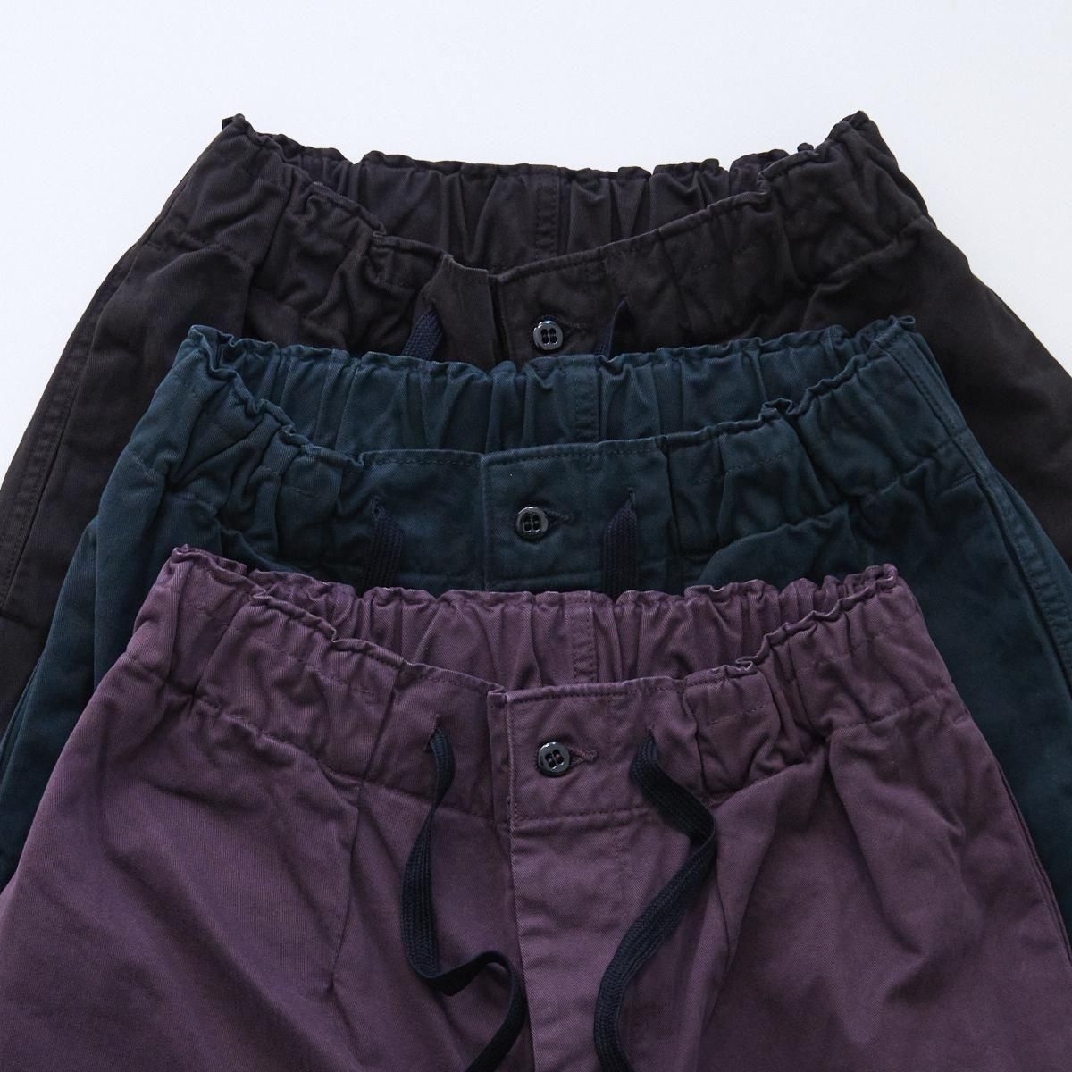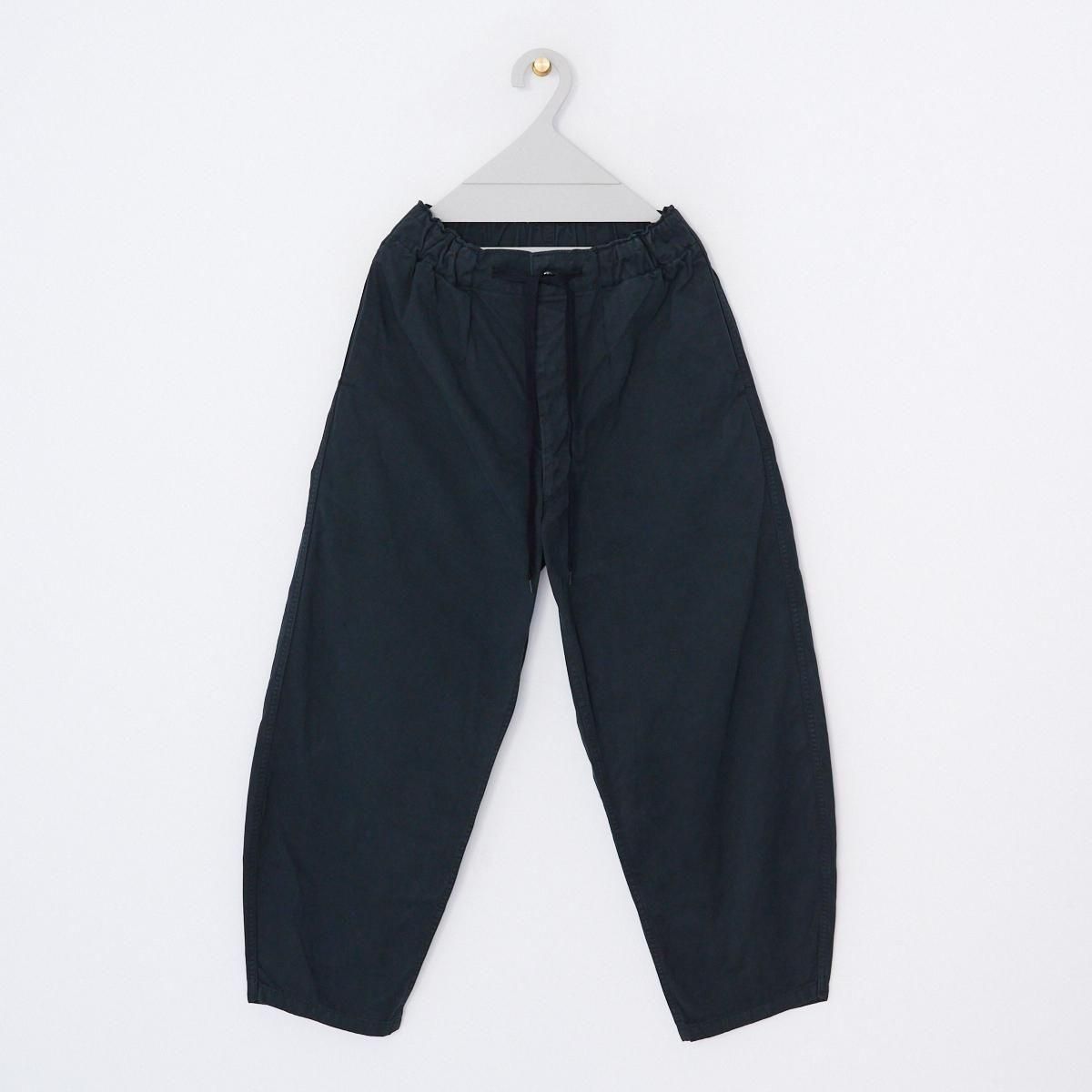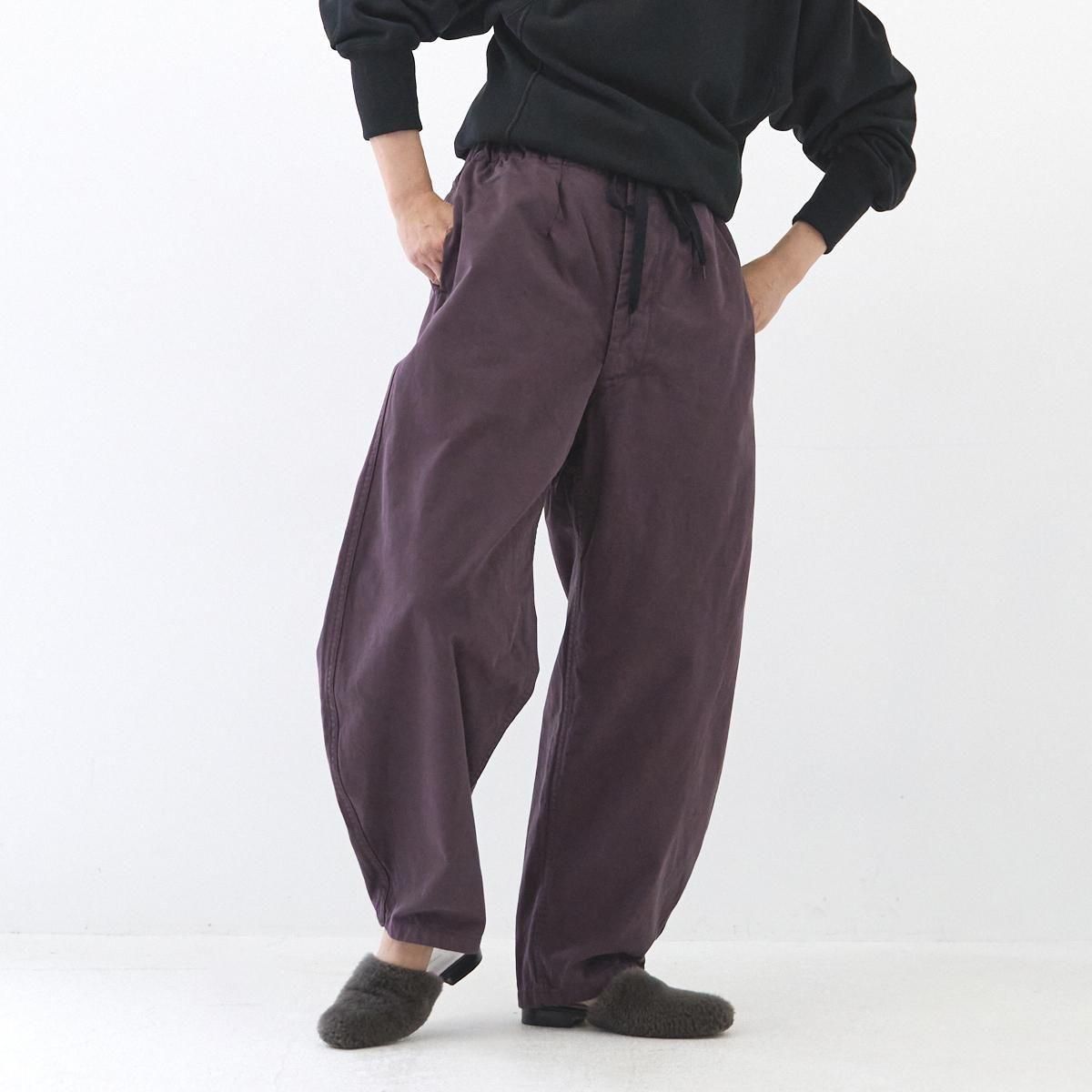 アウトシームを大胆にカットしたバナナレッグパンツ。固く染まりにくい高密度ツイルを製品染め加工。 ウエストは紐で調節可能。好みのサイズ感をお選びください。 greenとpurpleが25AW新色で登場です。 color:green/purple/black STYLE:0189 size:0・2・4 0:ウエスト~75cm 股上35cm 股下65cm ワタリ34cm 裾幅19cm 2:ウエスト~80cm 股上36cm 股下66cm ワタリ37cm 裾幅19cm 4:ウエスト~84cm 股上 37cm 股下 70cm ワタリ38cm 裾幅20.5cm material:cotton 100% model:163cm(サイズ2着用) 173cm(サイズ4着用) シームの縮み(縫製糸のパッカリングによる縮み) ウエスト:0.5cm程度 脇側総丈:0.7cm程度 インシーム(内股):0.5cm程度 ワタリ/ヒザ/スソ(周囲)・ほとんど縮みはありません ATTENTION! 製品染めのため最初のうちは余分な染料が脱落します。若干の色落ちにご注意下さい。 洗濯の際は裏返して必ず単独洗い(手洗い)し,陰干しすることをお勧めします。 高密度素材は水を含むと固くなり、あたりが付きやすい為、洗濯機をご使用の際も水量を かなり多めに設定し、手洗いモードやドライモードなどなるべく強い水流を避けて下さい。 中性洗剤などを使用し、塩素・過酸化水素などの脱色成分や、蛍光増白剤が無添加のも のを使用して下さい。ドローコードが絡まないようにご注意ください。 染色の特性上、ドライクリーニングはお避けください。 タンブラー乾燥はお避け下さい。 お取扱い店舗…dieci芝川ビル店 -------------------------------------------------------- TUKI(ツキ) 2004年に設立された、男女 2 名による日本のファッションレーベル。 設立当初からユニセックスなボトムスに取り組む姿勢は今も変わらず、オーセンティックとエ キセントリックの両面をデザインする。 最も得意なマテリアルはコットン素材で、時に意外性のある素材チョイスにも定評がある。 量産品がゆえに直線的なカッティングを好んで多用するが、 作られるシルエットは大胆でむしろ流動的なものが多い。 ウエストサイズの概念が非常に薄く、身長や骨格などのボディバランスでサイズチョイスさせるのもこのレーベルの特徴と言える。 size_chart