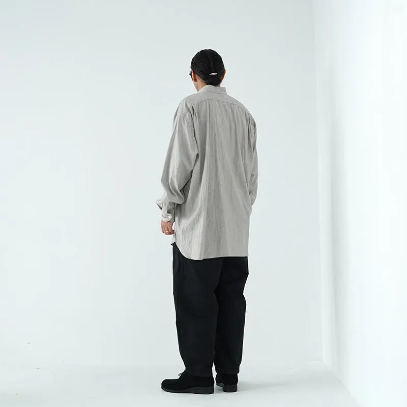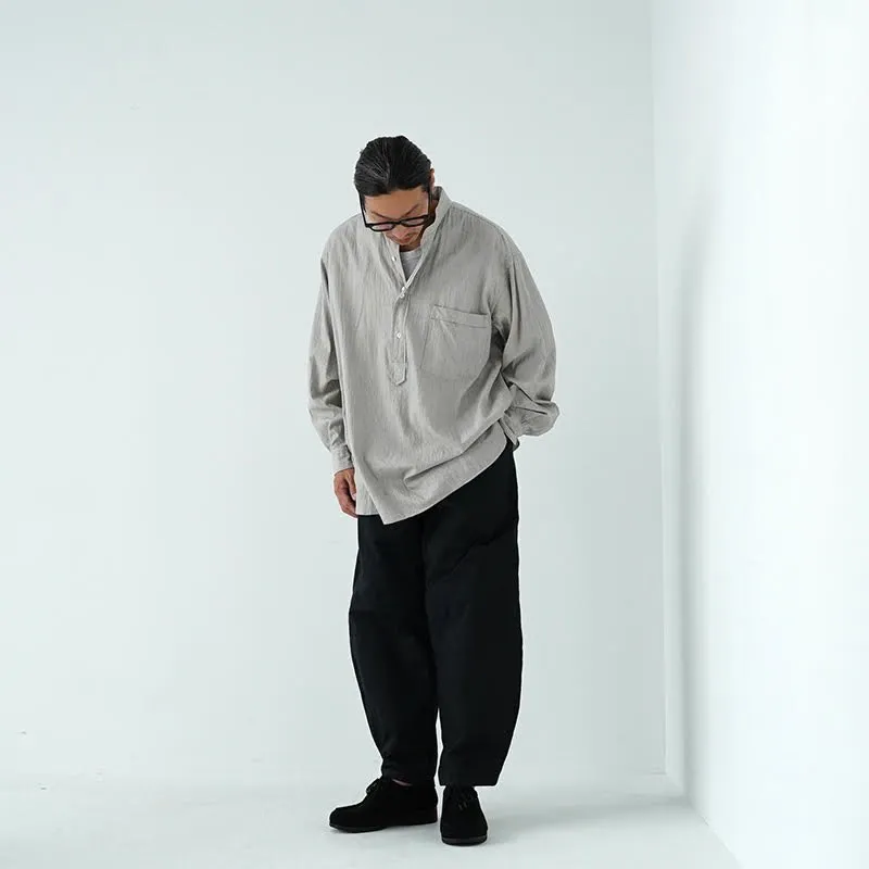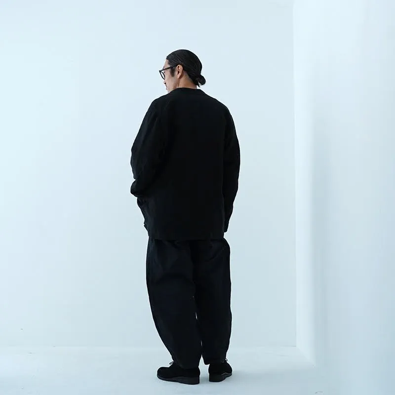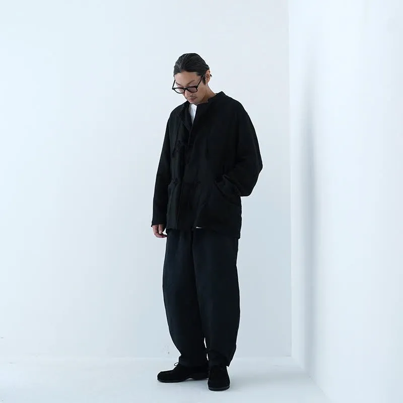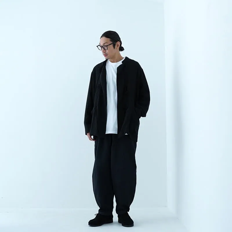 アウトシームを大胆にカットしたバナナレッグパンツ。固く染まりにくい高密度ツイルを製品染め加工。 ウエストは紐で調節可能。好みのサイズ感をお選びください。 greenとpurpleが25AW新色で登場です。 color:green/purple/black STYLE:0189 size:0・2・4 0:ウエスト~75cm 股上35cm 股下65cm ワタリ34cm 裾幅19cm 2:ウエスト~80cm 股上36cm 股下66cm ワタリ37cm 裾幅19cm 4:ウエスト~84cm 股上 37cm 股下 70cm ワタリ38cm 裾幅20.5cm material:cotton 100% model:163cm(サイズ2着用) 173cm(サイズ4着用) シームの縮み(縫製糸のパッカリングによる縮み) ウエスト:0.5cm程度 脇側総丈:0.7cm程度 インシーム(内股):0.5cm程度 ワタリ/ヒザ/スソ(周囲)・ほとんど縮みはありません ATTENTION! 製品染めのため最初のうちは余分な染料が脱落します。若干の色落ちにご注意下さい。 洗濯の際は裏返して必ず単独洗い(手洗い)し,陰干しすることをお勧めします。 高密度素材は水を含むと固くなり、あたりが付きやすい為、洗濯機をご使用の際も水量を かなり多めに設定し、手洗いモードやドライモードなどなるべく強い水流を避けて下さい。 中性洗剤などを使用し、塩素・過酸化水素などの脱色成分や、蛍光増白剤が無添加のも のを使用して下さい。ドローコードが絡まないようにご注意ください。 染色の特性上、ドライクリーニングはお避けください。 タンブラー乾燥はお避け下さい。 お取扱い店舗…dieci芝川ビル店 -------------------------------------------------------- TUKI(ツキ) 2004年に設立された、男女 2 名による日本のファッションレーベル。 設立当初からユニセックスなボトムスに取り組む姿勢は今も変わらず、オーセンティックとエ キセントリックの両面をデザインする。 最も得意なマテリアルはコットン素材で、時に意外性のある素材チョイスにも定評がある。 量産品がゆえに直線的なカッティングを好んで多用するが、 作られるシルエットは大胆でむしろ流動的なものが多い。 ウエストサイズの概念が非常に薄く、身長や骨格などのボディバランスでサイズチョイスさせるのもこのレーベルの特徴と言える。 size_chart