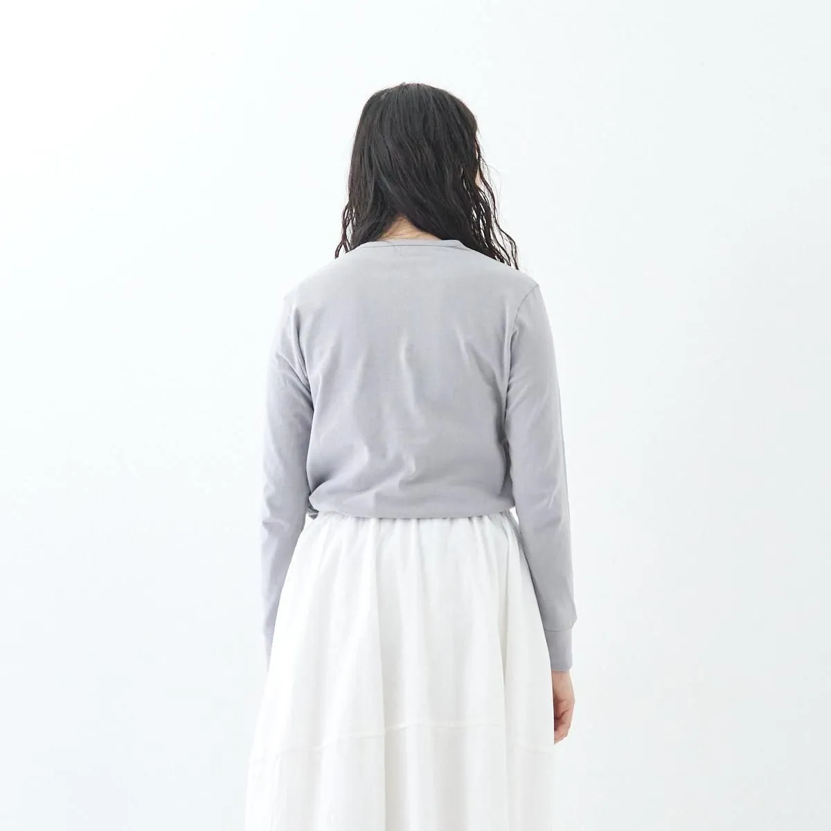 ふっくらと編まれた天竺生地のカットソー。柔らかく適度な厚みがあるので一枚でも安心して着ていただけます。 ネック周りは細めのリブで女性らしい華奢な印象に。胸元についたポケットがささやかなアクセントとしてデザインされています。裾と袖口にもリブの切り替えが施されているので、スウェットに近いイメージでお召しいただけます。 25AW size:2(one size) 着丈62cm/身幅47cm/肩幅38.5cm/袖丈57cm ※サイズ計測の多少の誤差はご了承下さい。 color:ネイビー/ブラック/ライトグレー/ホワイト/ material:コットン100% model:168cm (ライトグレー) 取り扱い店舗・・・dieci kyutaro店 2F -------------------------------------------------------- ゴーシュ 普遍的な新しさをテーマに、カッティングやテキスタイルにこだわり、シンプルながらこだわりを感じることが出来る、飽きの来ない衣服を生み出すブランド。日常に寄り添う着心地の良さ、凛とした静かな美しさを追求しています。 size_chart