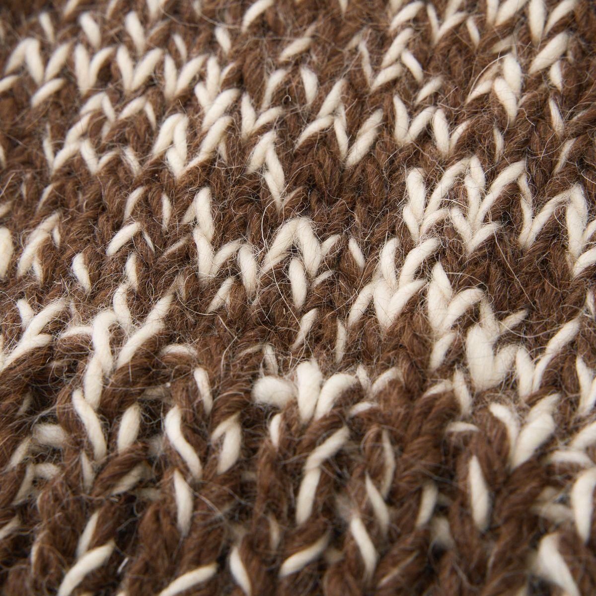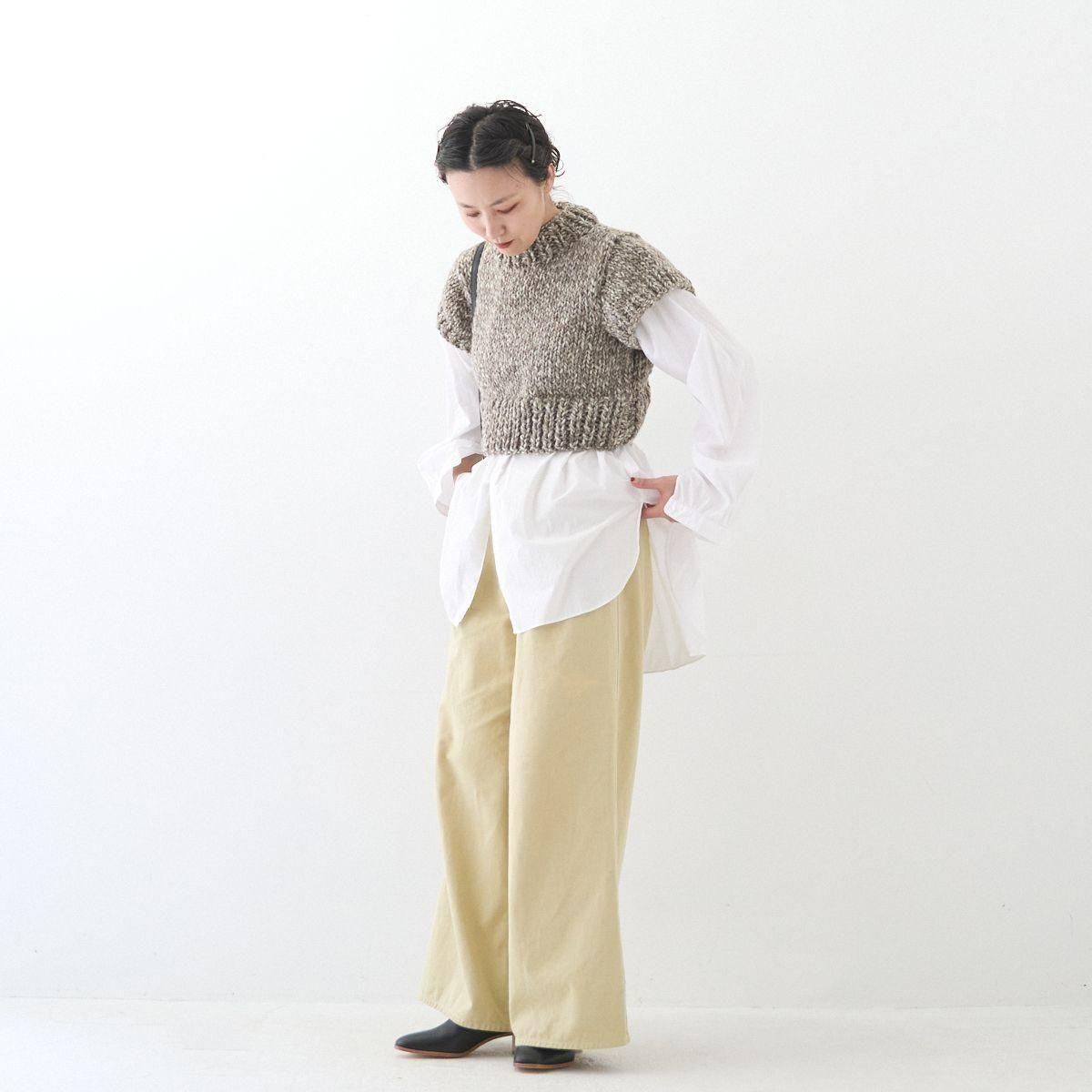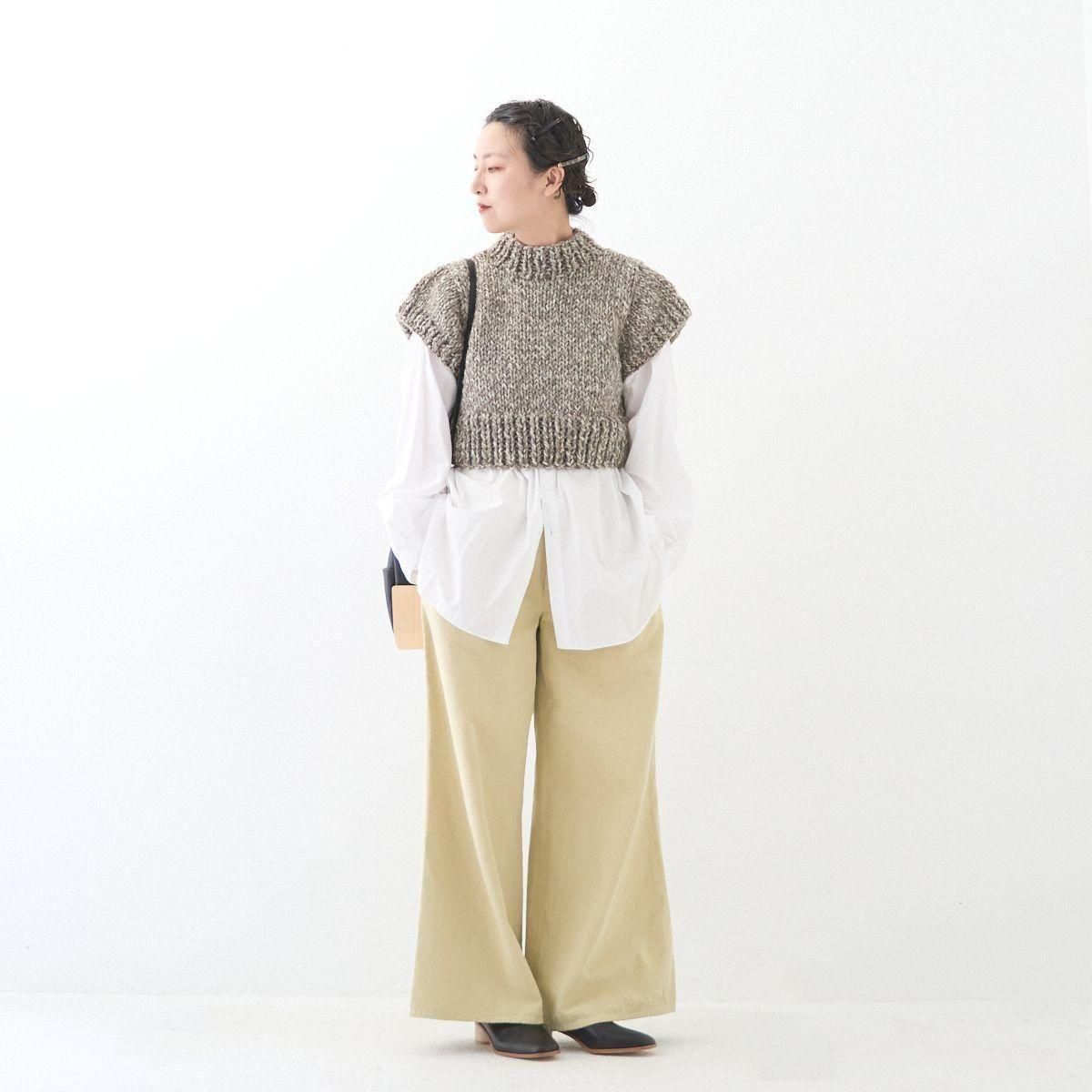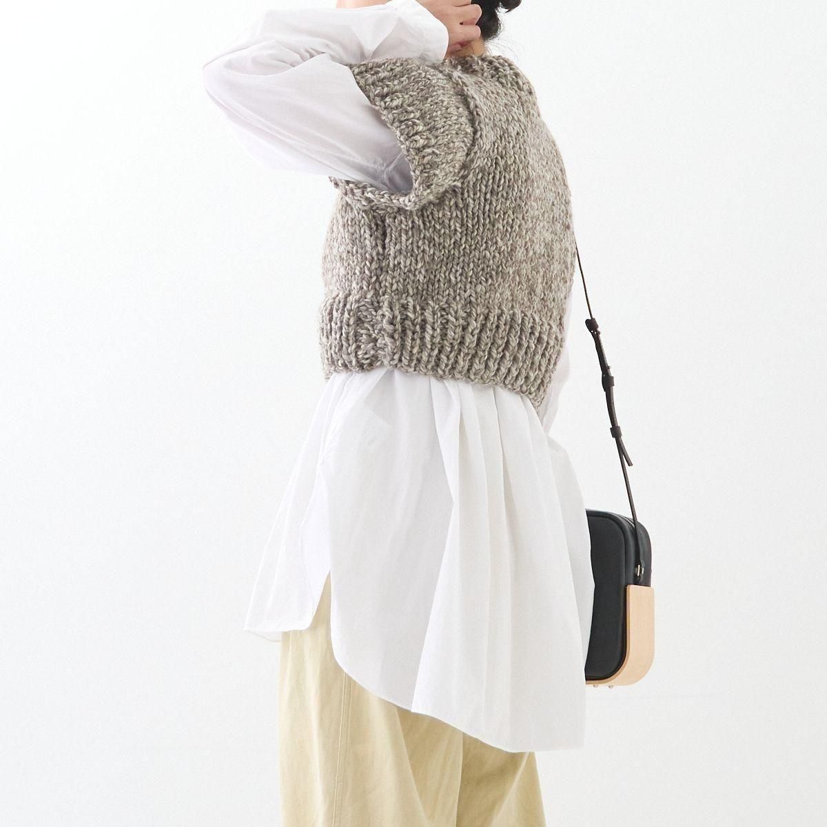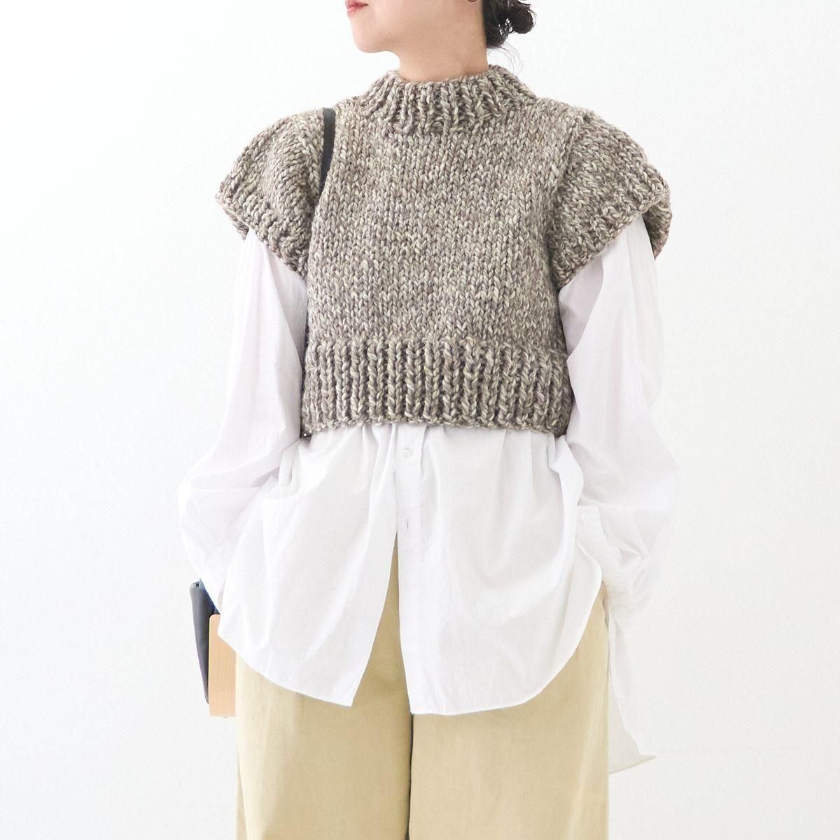 ざっくりと編み上げた糸のミックス感が素敵な半袖ニットです。 見た目ほどの重量もなくレイヤードも楽しめるニットです。 color: CHOCOLATE MERANGE(ブラウンベース) , VISON MEKANGE size: S 着丈42cm 身幅46cm 袖丈14cm 肩幅34cm ※ハンドニットの為、個体差がございます。 material:virgin wool100% model: 163cm ----------------------------------------------- MAYDIはロンドンのファッションカレッジ卒のアルゼンチン人女性デザイナー、Maria Zolezziにより2014年スタート。デザイナーの故郷であるアルゼンチンで。持続可能かつ自然由来であることにこだわった天然素材・染色を使用。またMAYDIのニットは全てアルゼンチンの伝統的な手織り方法で織られております。 お取り扱い店舗・・・dieci芝川ビル店